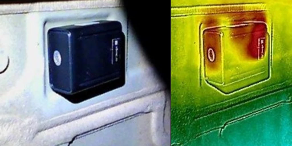 After about 10 minutes of examination, alarms for transmission were triggered on both present RAKSA detectors. The difference in signal strength levels of 21 dB and 38 dB indicated the rear half of the car as the direction from which the detected signal originated. Technicians reacted by modifying the layout of the detectors to narrow down the area and determine whether the signal source was from within the car or behind it. Despite the technicians’ prompt response to the alarm, it was not possible to repeat the measurement in the changed configuration during the subsequent 50 minutes. No cyclic transmissions were detected emanating from the vehicle, and the intercepted signal was likely incidental. In the further course of the examination, the technician working with the low-frequency magnetic field detector drew attention to suspicious readings from the vicinity of the rear left fender, where it meets the bumper. Thermal imaging camera did not confirm any deviations in the thermal signature, which could otherwise suggest the presence of a device on the other side of the car’s body panel. The use of other detection devices in this area did not provide resolution. Technicians proceeded to physically inspect the vehicle’s interior and undercarriage, hoping for a repeat alarm from the still monitoring RAKSA. Using a mirror and flashlight, the technician inspecting the undercarriage revealed an unknown device attached to a flat structural element near the location previously indicated by the ST-600 detector as suspicious. Upon directing the thermal imaging camera towards the detected device, it was found to be significantly warmer than its surroundings, indicating it was active. The detected device resembled a commonly found GPS locator with magnetic mounting on the market. However, no transmissions were detected from this device during the examination, which could indicate it was either in a dormant state or lacked SIM card resources. In accordance with the directive, the device was removed from the vehicle and returned to the client in its original condition. This decision aligned with the client’s action plan. Subsequent examination did not reveal the presence of any other surveillance devices, including microphones, GSM listening devices, hidden cameras, or other locating devices, including those based on Bluetooth technology.